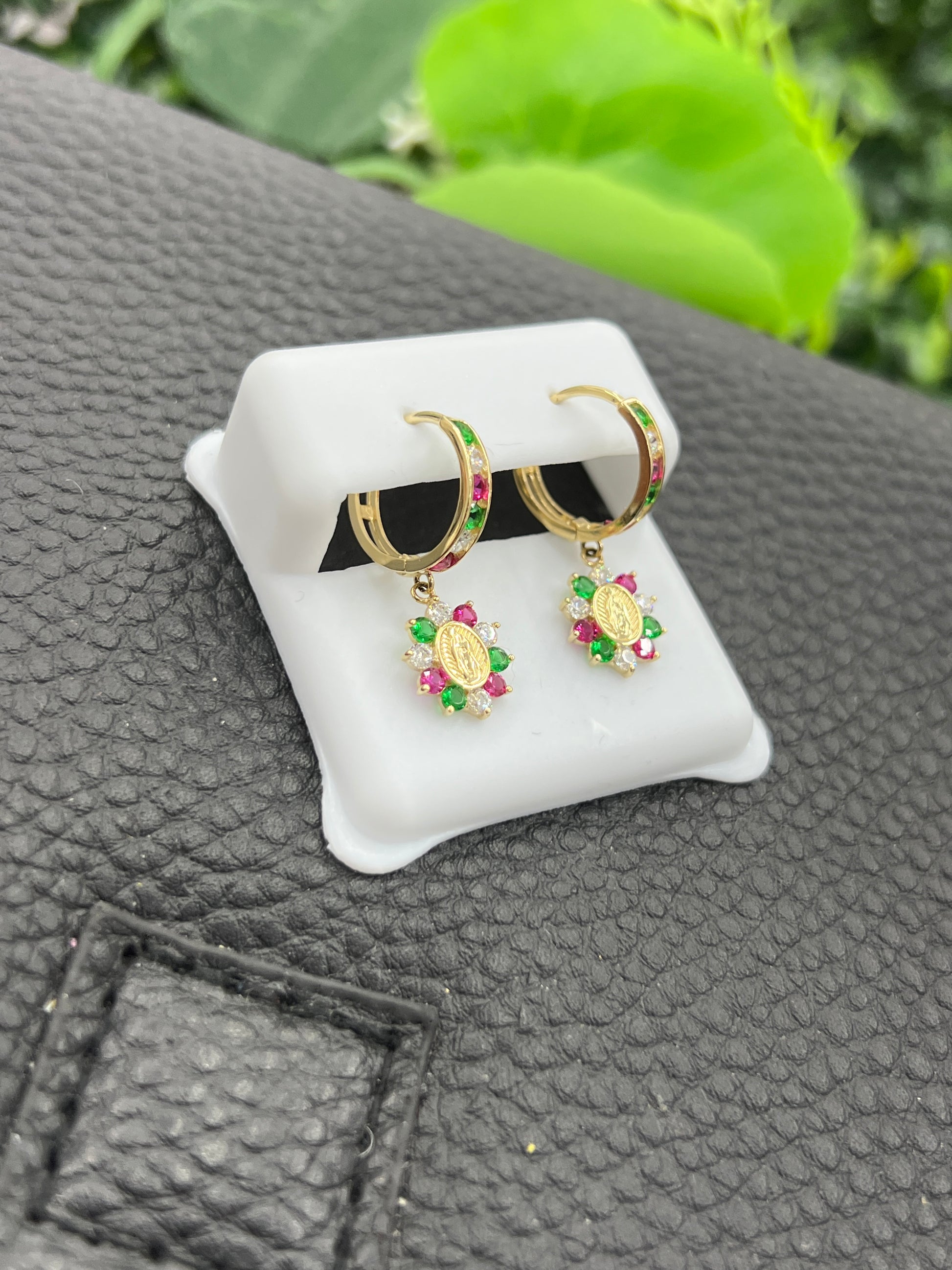 14K Yellow Gold CZ Virgen de Guadalupe Huggies Earrings for Womens Flowers