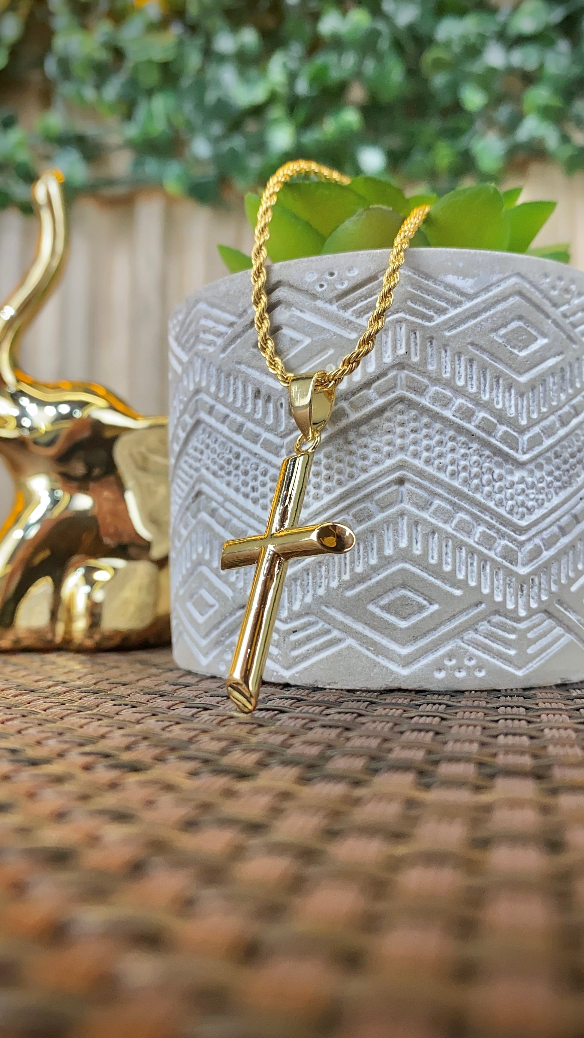 The image shows the cross necklace with the crucifix charm pendant and the rope chain. The design is simple yet elegant, making it a versatile accessory for any outfit.