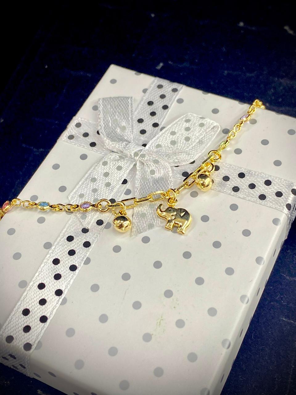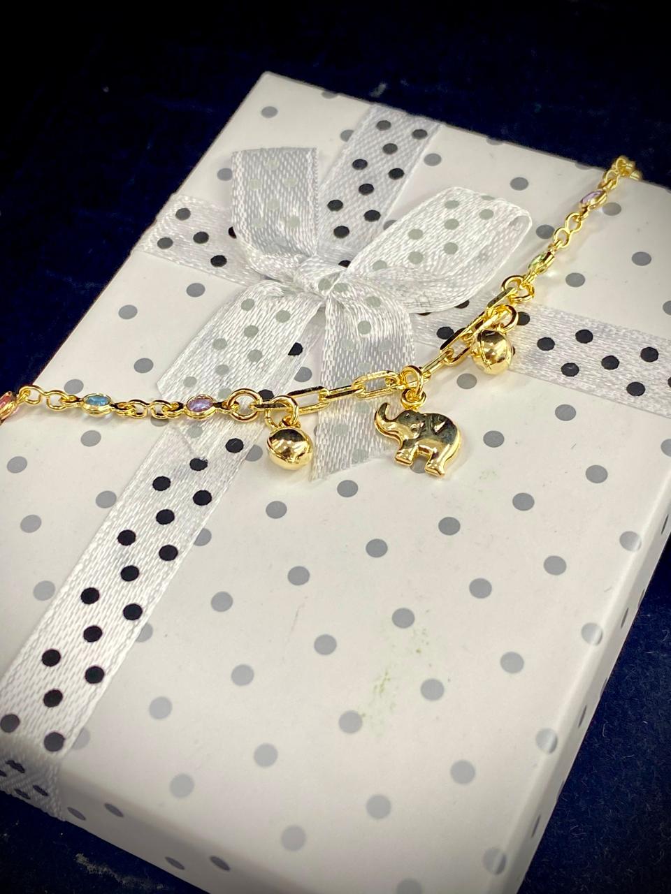 Elevate your style with our Anklet Bracelet Elephant adorned with colorful CZ stones, designed exclusively for women. Featuring a playful elephant charm, this anklet exudes whimsical charm and adds a touch of bohemian flair to any ensemble. With a length of 10 inches, it drapes elegantly around the ankle, capturing attention with its vibrant hues and intricate detailing. Perfect for adding a pop of color to your summer look or as a thoughtful gift for a loved one who adores unique and stylish accessories.